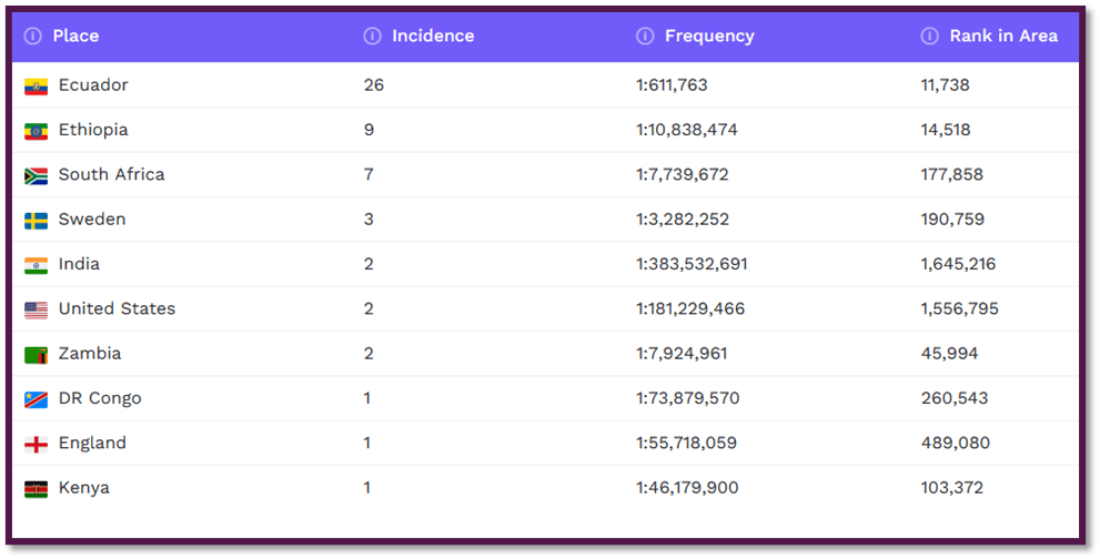 That the second most common distribution of the name is in Ethiopia is interesting for this is the area chosen to home Milo’s family name – in fact his matrilineal name. Of course, this is because undocumented immigration was more likely from Ethiopia than Ecuador but it might also show the writer choosing a name with an indeterminacy in its origin that is probably crucial for Milo. Campbell’s wife is told a fuller story that: