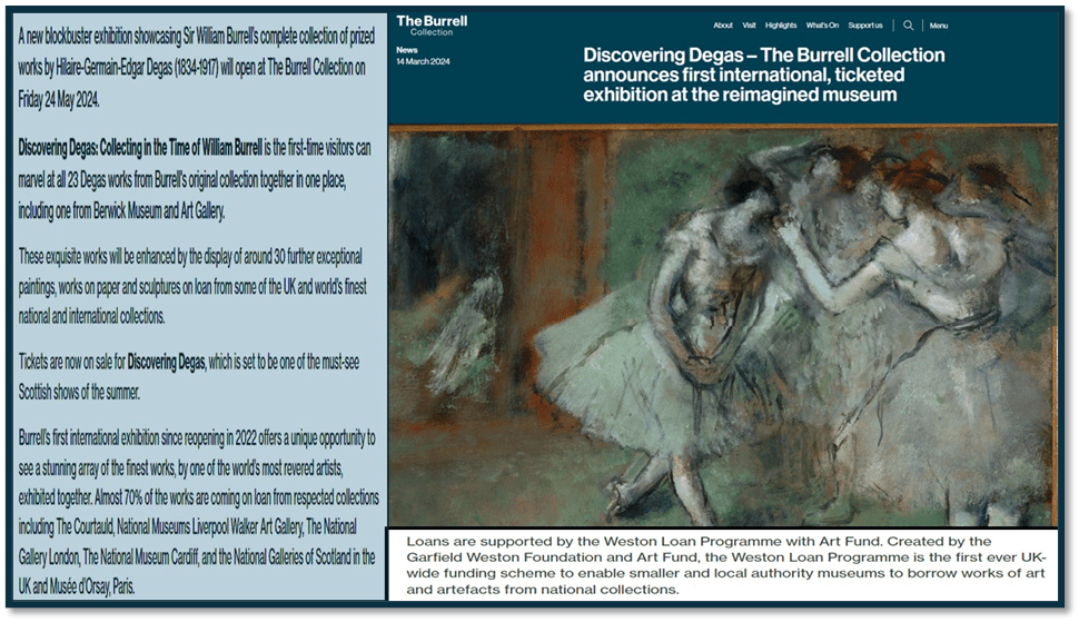 Tomorrow we are going to Glasgow, the main point of which is to see the exhibition named Discovering Degas: Collecting in the Time of William Burrell, on its opening day on Friday May 24th, the opening day of the exhibition. As yet I have not seen the catalogue and I have not been informed yet that it is available from Glasgow City Life, the organisation which sells the tickets. I like to prepare myself for exhibitions by thinking about the issues it aims to cover. However, since this time, I cannot do that because I have no idea of which paintings will appear there – amongst the 70 boasted on the website from both The Burrell Collections own holdings (23 in total) and those borrowed from other galleries.