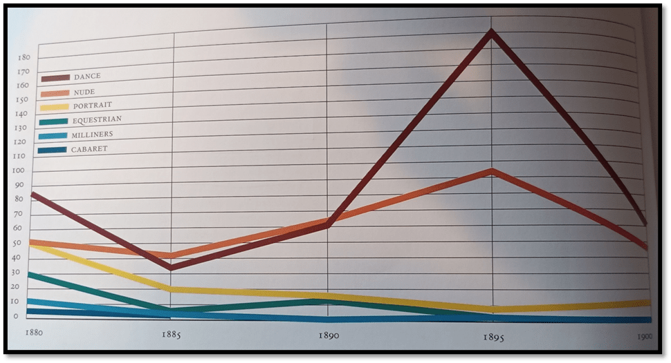 The changing patterns of Degas’s principal subjects from Kendall, op.cit: 126
