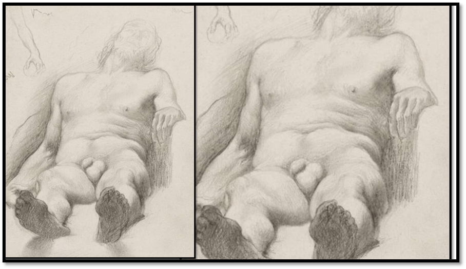 Nevertheless, the later example here (on the left) has considerably less relation to the classical nude, an idealised form created from the mind alone perfecting what it sees, than the one on the right from 1856, I think. The man is physically more fleshed out, his penis appears and is not of the type of the Classical nude, being thicker and more prominent but nevertheless collapsed. The knees have distinct knobbles and the resistance of the raised fist seems to contest the effect of the body being sequestered into a corner, as if by violence. Yet there is very little in either that is not an academic study. I would say that what differentiates the second most from the classical ideal of the male nude is the hint of vulnerability, and of weakness, despite a motion of resistance.