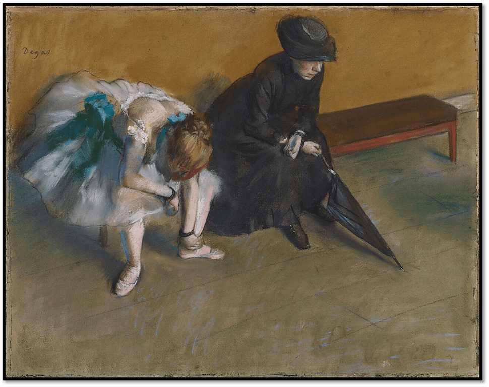 This then is the thesis I want to take to Glasgow to test. Though early in his career he could reproduce the brothel in painting, his later laundresses or milliners are of a piece of presenting women not as objects of male desire but as workers, and later observed in self-absorbed self-care for her own reasons. it matches the earlier social realist interest in the pictures of woman at work, often expressing the effects of overwork and lack of rest. And, truth to tell this is the interest involved in the late ballet-dancers, whom we see often in arduous rehearsal of a body strained beyond nature, attending to strain in their limbs and in inelegant postures, rarely facing the viewer or wanting to be aware of the viewer as in the 1882 painting Waiting or Two Dancers Resting (after 1879) and often taken as a subject in late pastels: