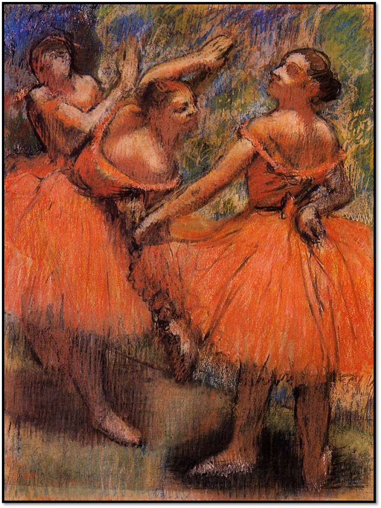 Although Kendall does not reference Cullen, his 1996 book takes similar insights to these further, and in a different way; he, for instance, sees tone but not line as collaborative with the feminised in painting. Kendall cites Degas as often championing, in words at least, a tough line, like that in Ingres, as the basis of graphic figure drawing, as opposed to the soft use of multi-colour in a feminised Delacroix. In practice however, Degas often drew and painted using tonal methods only with multiple coloured pastels integrated with other binding matter, as if he was advancing on Delacroix rather than Ingres and dedicated, not to stability and precision of delineated vision but to what the queer Joris-Karl Huysmans called ‘the marriage and adultery of colours’. At least thos is clearly so in his latter phase – the subject of Kendall’s book. This is evident in one picture I know will be in the exhibition for its is a star of that collection, Red Ballet Skirts (1897-1901).[4]