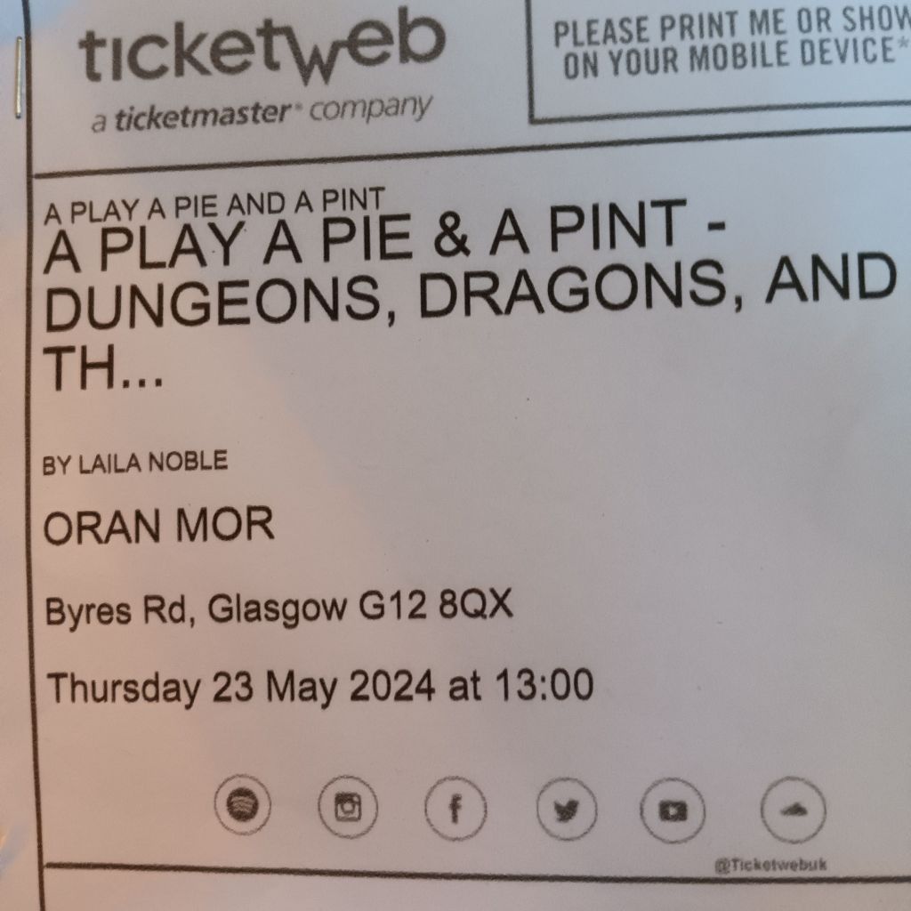 Wiley’s best friend, Finn, played by the adorable Ciaran Stewart, arrives to tell of a date he has in the offing that he feels afraid to attend, even though he thinks the guy, named Richard, might be a possible contender for the lover rather than just a lover. The issue, however, is that Finn has never had sex with anyone before, though he has claimed / lied to Wiley that he has. The answer Wiley thinks is for Finn and Wiley to enact how fear of sex might be defeated using a set of imagined DnD scenarios. The highlight of the play is the fine BSL enactment of the taming of sexual Fearfright, the second and only other one to be done with voiced language as well, which stuns snd somehow makes the fear of erectile dysfunction or laughable sexual.performsnce capacity not only fun to see enacted but really meaningful. It is a theme contributed to in mime, clever use of properties, including the ‘erection’ of a bed tent using a pole to represent a mountain overshadowing a town compounded of the fear of sex, as well as some fine dual-language dialogue.