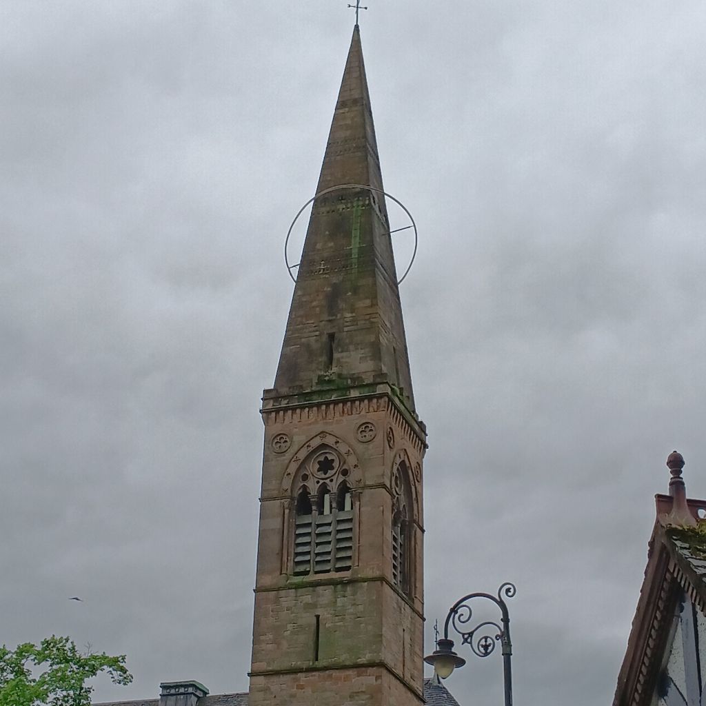 Then to buy more parking time, [£1 per 15 minutes], and to Òran Mór, just pausing to see the wonderful cosmic symbol on the spire, framed by a very wet grey sky: