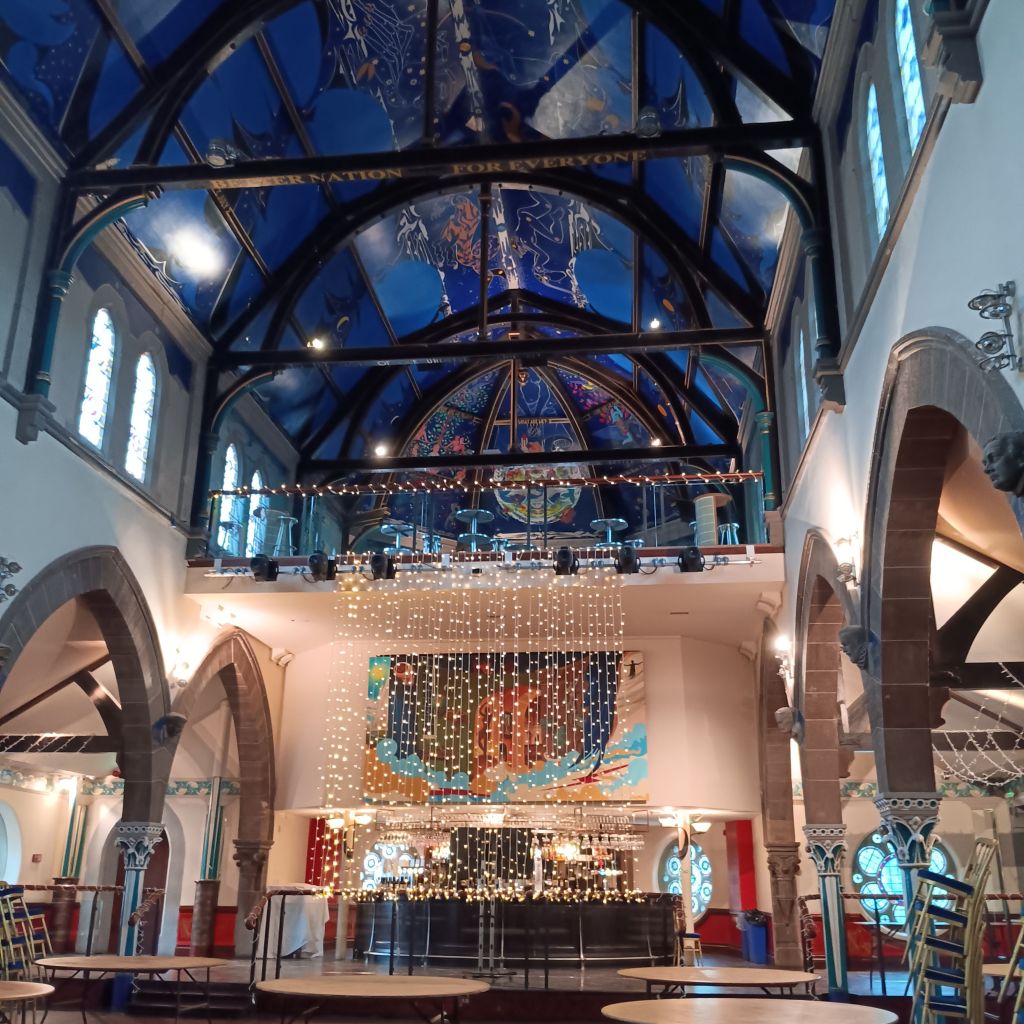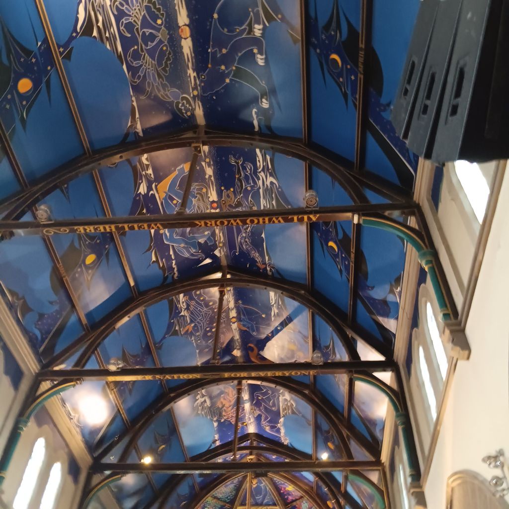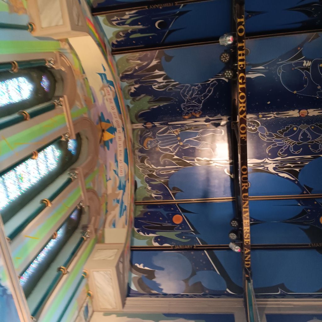 Daisy ensconced in the car, we were early enough inside Òran Mór to ask for an escort to see the painted roof by Alasdair Gray. You go up 2 floors to the church space, used for communal events like concerts and weddings. The spiral staircase is atmospheric.
