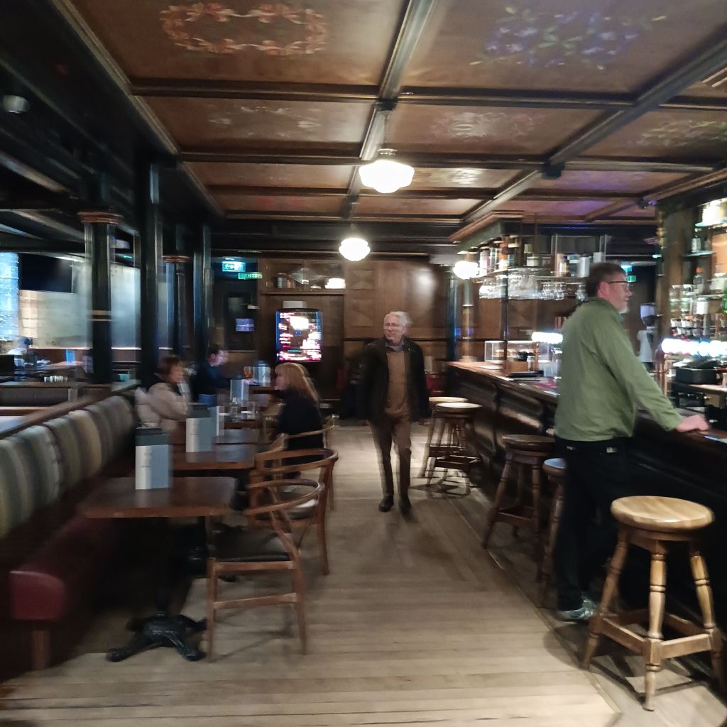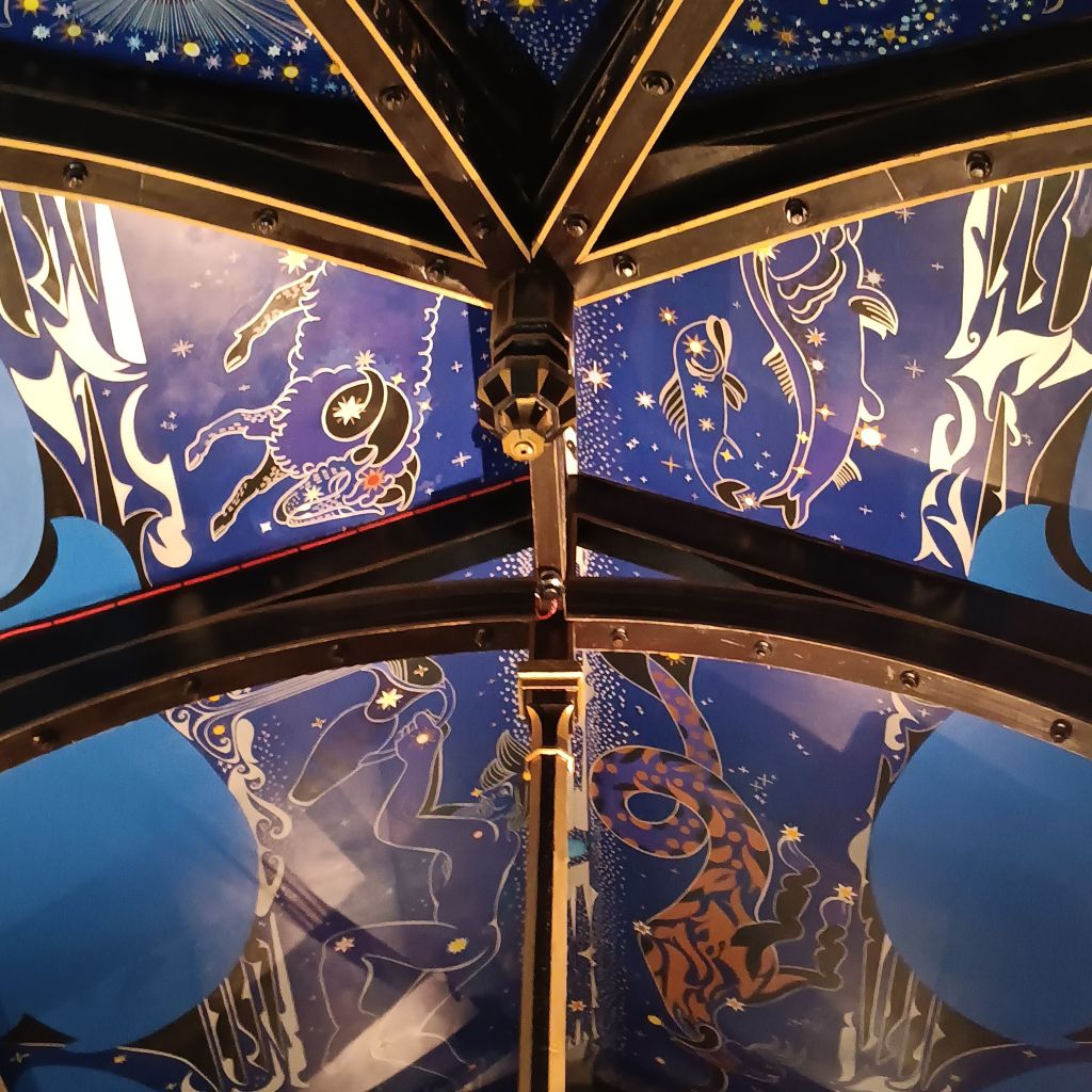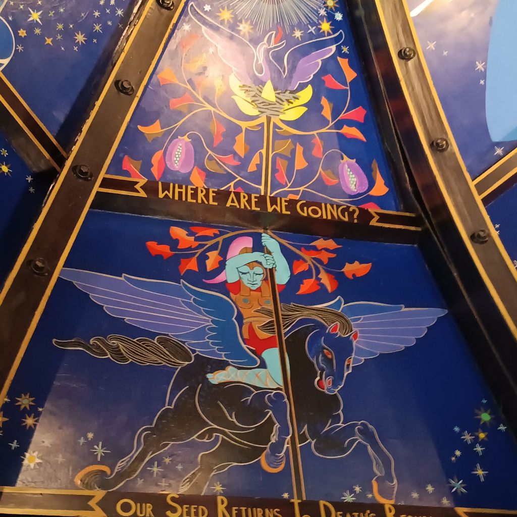 Daisy ensconced in the car, we were early enough inside Òran Mór to ask for an escort to see the painted roof by Alasdair Gray. You go up 2 floors to the church space, used for communal events like concerts and weddings. The spiral staircase is atmospheric.