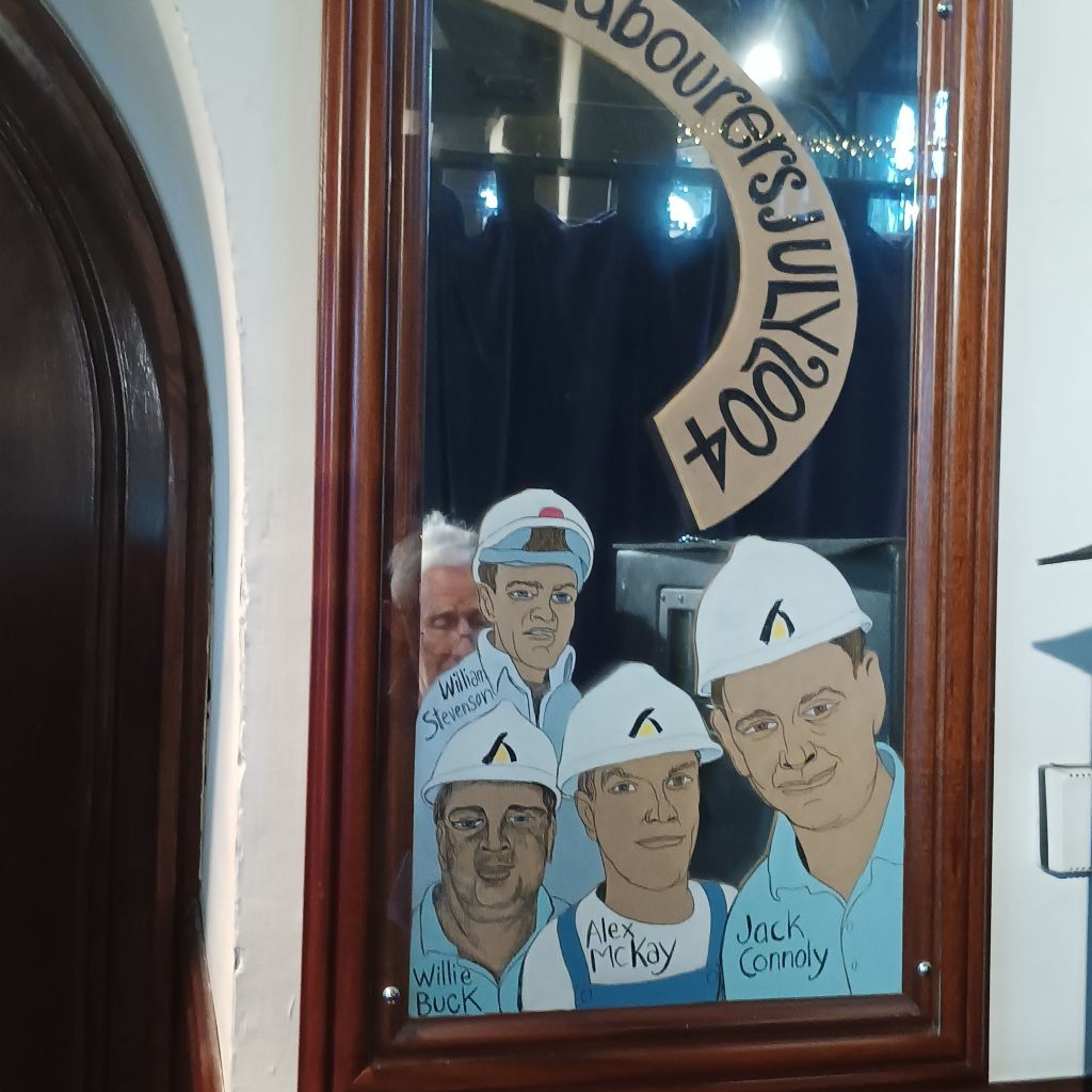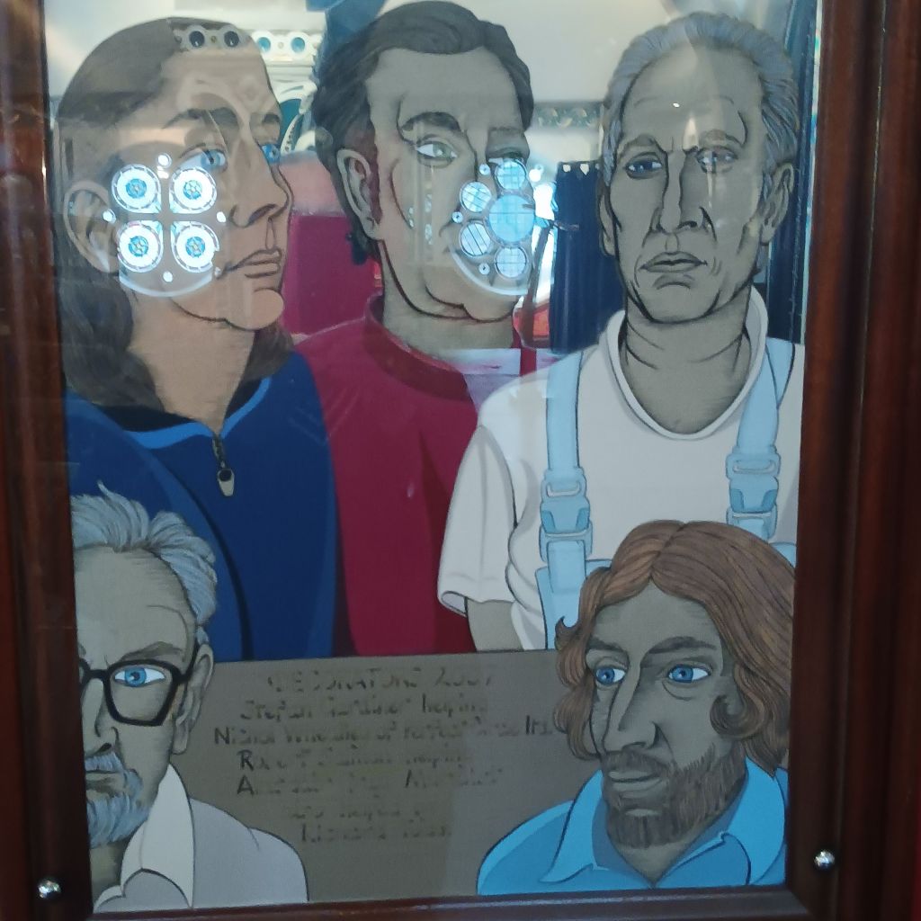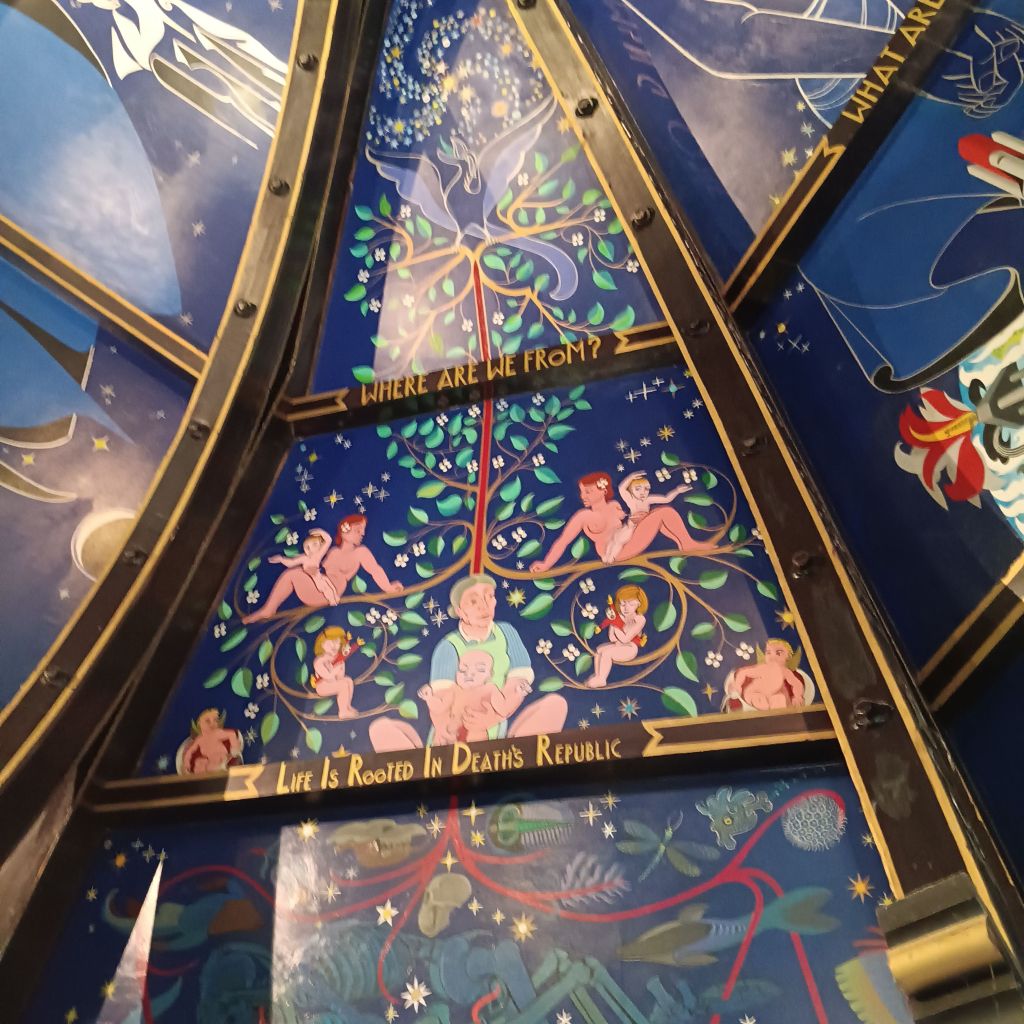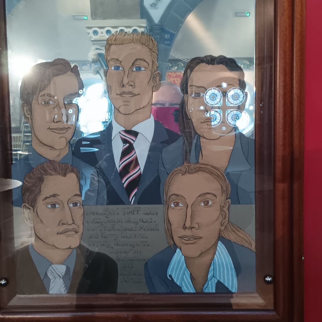 I spoke earlier of the young Glaswgian guy’s respect for his colleagues. He ended his tour by showing us Gray’s mirror art bearing the face of the makers and workers at Òran Mór. Gray valued people in an explicitly non-hierarchixal manner. all of these were collegiate makers of the art of Òran Mór. The young guy, though he said he would be 4 at the time of the painting, still felt part of this group, some of which still worked at Òran Mór.