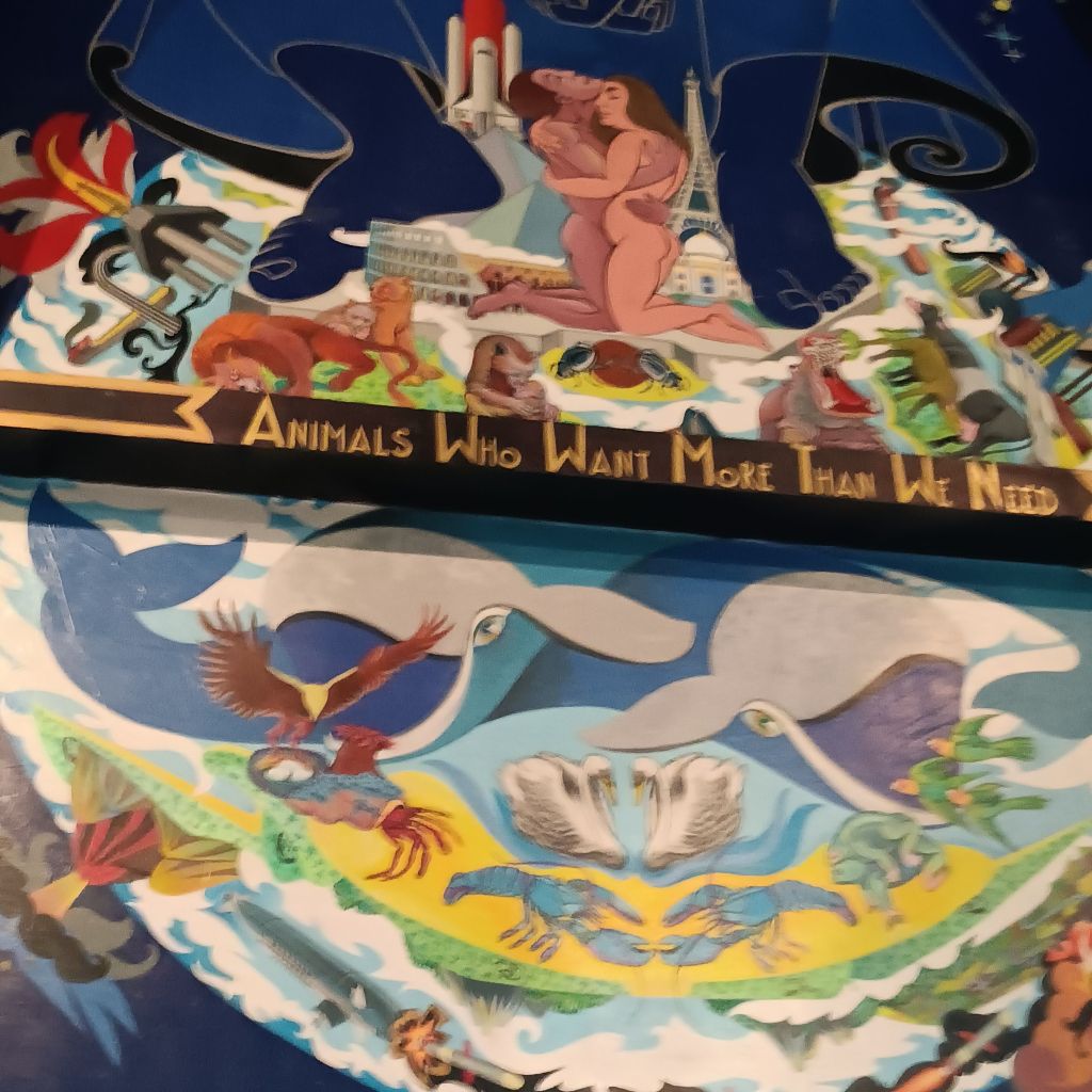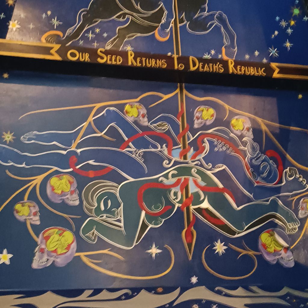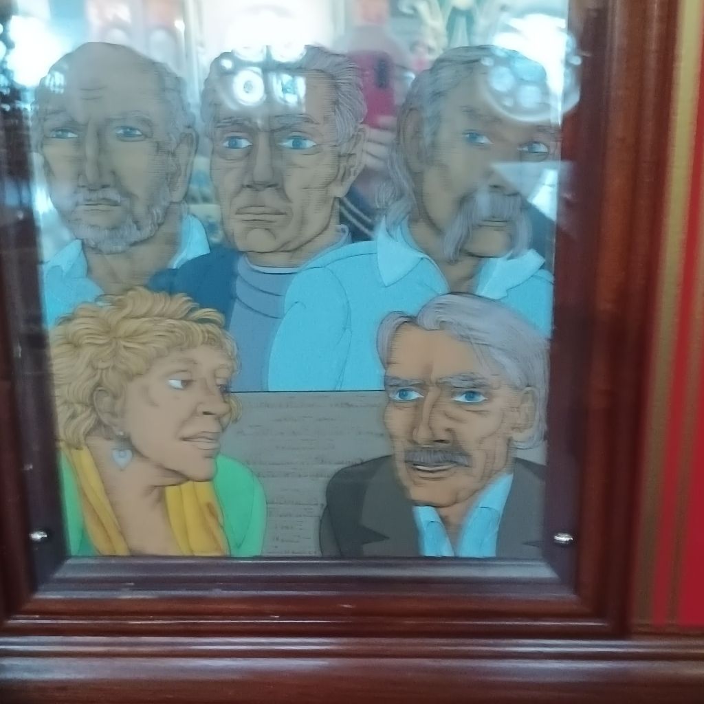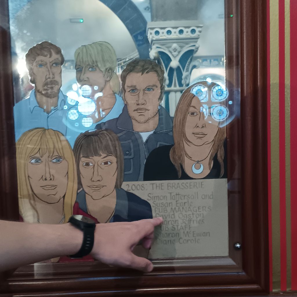 I spoke earlier of the young Glaswgian guy’s respect for his colleagues. He ended his tour by showing us Gray’s mirror art bearing the face of the makers and workers at Òran Mór. Gray valued people in an explicitly non-hierarchixal manner. all of these were collegiate makers of the art of Òran Mór. The young guy, though he said he would be 4 at the time of the painting, still felt part of this group, some of which still worked at Òran Mór.