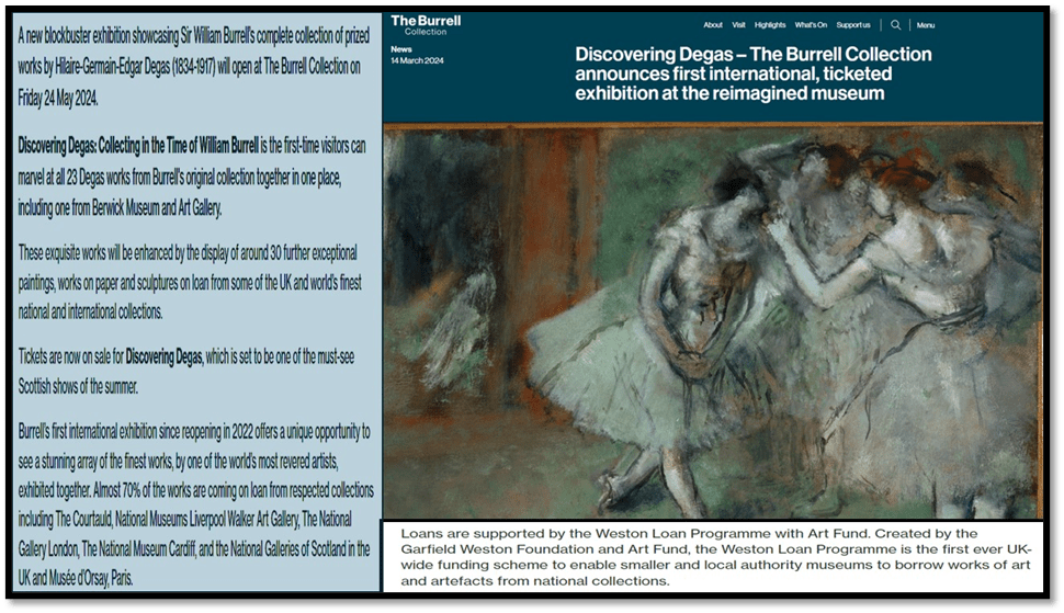 Visiting the Discovering Degas exhibition at the Burrell Collection in Pollok County Park, Glasgow on its opening day on 24th May 2024 at 12 noon.