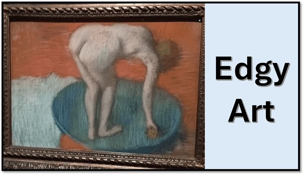 I label this ‘edgy art’ in part to reference the debate I mentioned in my preparatory blog about the supposed voyeuristic quality of a nude woman caught unawares. My own feeling is that Degas is more interest in its edginess as a challenge to the representation of edges – those between objects and flesh and between masses of flesh, such as that which characterises the crack of the woman’s anus and she bends, balancing herself by squeezing her thighs together to create a more solid balance on the tub. Huysmans who was openly queer felt, as the catalogue tells us, that such details represented women and female flesh as undesirable and ugly, and was cruel to women. Degas disagreed wanting to show women ‘only concerned with their physical habits’.[14] Correct is correct, of course, for to see the body as it is and not as iconic of either self-sustaining objective beauty or of the desire of the viewer, male or female. Hence the geometric and linear structures and passages of complex nuanced colour, in flesh and objects. The colours in the body especially on the thigh facing us, reflect the blue of the tub itself. Degas is not sacrificing woman to male gaze but trying to persuade us that in what we call the ‘real world’ we rarely see women (or men come that) as they are but as some socio-cultural cognitive mode filter our perception top-down of what body form actually is. And it is a thin of asymmetrical cracks and volumes and masses of substantial flesh in our everyday actions in men as in women. However the standard Degas had to challenge at the time was the set standard of the beautiful as feminine.