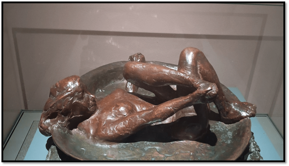 As I now hover between floors in the exhibition, I will bring together, as I do in the collage below (titled on the collage), sculptures in vitrines on both (only the larger figure being on the top floor, and an undressed study of the famous trainee ballet-dancer of 14 years-of-age.