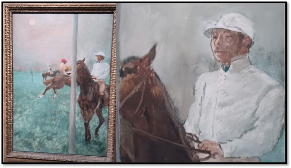 He renders them not gazed at – for the role of the viewer is further to make them into wholes in their imagination. Whatever, the gaze is not sexualised. I think this is why we get no faces, or when we do, get a kind of stereotyped face that was often thought of as ugly, like the faces in Three Dancers above. His model Pauline used to complain that he did not represent her own good looking face. And he did this with his other stereotypical if earlier subject, male racehorse-riders. Here is his best example JockeysBefore the Race (1878-9 again using oil essence).