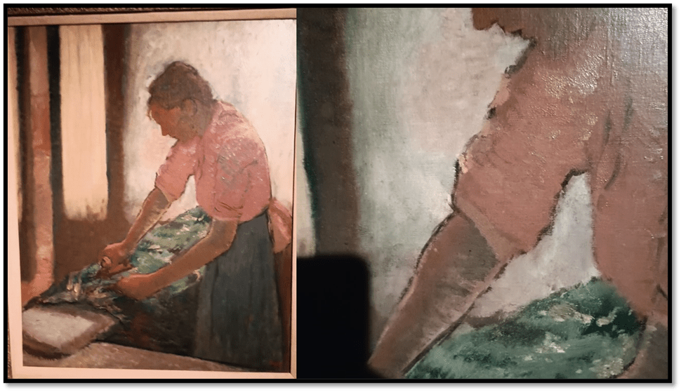 No other painting I saw or knew makes the case so clearly that I made in my preparatory blog for the ways in which Degas used overlayed marks of oil to defuse the objectivity of the figure – feminise it, I claimed. And no other plays such tricks in doing so between model, foreground and background, where reflections of paint define a ragged space which, while behind the girl in our perception mainly, seem from the bottom left hand corner and along the frame edge at bottom seem to grow as a screen that is about to engulf her image below it. Likewise see how yellow brushstrokes efface the barrier between hair and dress, and perhaps the flesh of her torso. Imperceptible reds become clearer on further gazing on her cheeks, striated with other colours, lips and eyes.