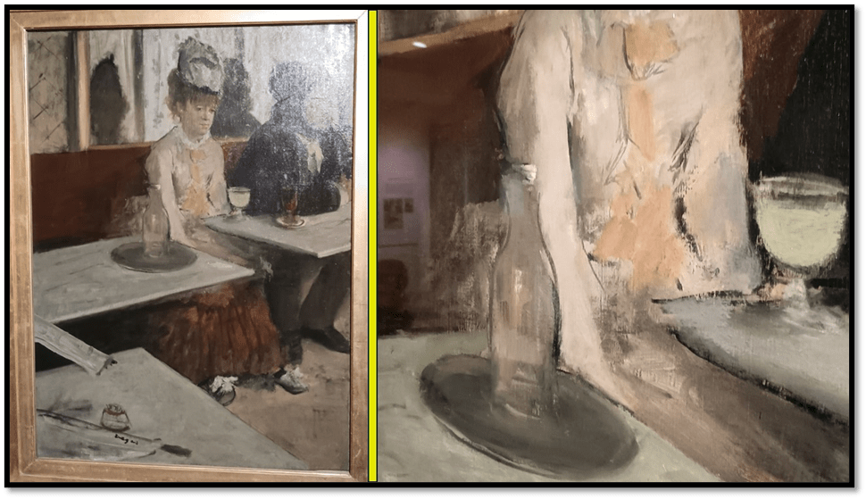 On the same intermezzine floor in the gallery we see the early great paintings that precede that latter stage with paintings of women absorbed in their independent minds and bodies. This is the great transitional object, for it transitions into an absorbed subjectivity in the painter, for the late Degas. In the early works, Degas is fascinated in marginal women – wome who do not seek attention, though these women, unlike the latter ones are bound by the codes of patriarchal capitalism. They include women deemed by society to be an underclass, whether as prostitutes, outcasts or workers in very low-paid jobs, often laundresses. In Zola, these women form a means of understanding the unseen female underbelly of Paris in L’Assommoir, published as a serial in 1876, and in book form in 1877. I think Degas is working in similar vein in the early works. In, for instance, L’Absinthe (known in English as In a Café, thus missing the central murky glass of the aniseed high-alcohol drink at the picture near-centre).