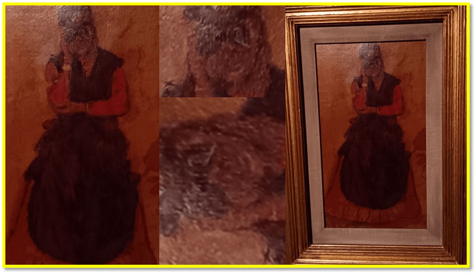 However, in the schedule of exhibition I have jumped to pictures at its end on the lower floor, bypassing all those lives of collectors, There is much beauty in the upper entry floor but I want to pick out only 2 other works that I did not previously know. They are in the collage below, respectively from left to right: At the Café de Châteaudun (1869-71), a work of urban observation, and A Peasant Woman (1871). I cannot know how I might interpret these pictures but the intrigue me. One comparison though seems clear. The catalogue imagines a narrative behind the young lower-class rural women, holding a piece of paper (they guess a letter from a lover away in the Franco-Prussian wars) and gazing in the far distance at the receipt of news that makes her sad.[8] We will never know. As far as we can go is to admire the capture of a female self-absorption that is not meant to excite erotically/.Patterns of light and shade make this a painting of mood not appearance – achieved by painterly methodologies that feel to me quite amazing. The feeling is part of cognitive-emotional depth created by paint.
