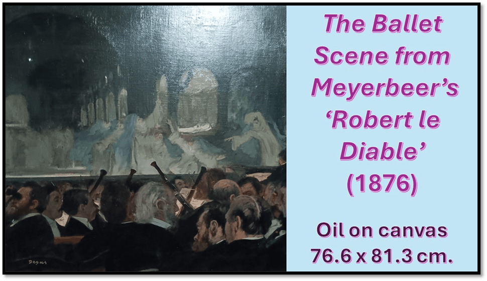 I meant to ask the question in the collage about whether curatorial matters ‘matter’, for when the curatorial focus is like this, we need to find a way of seeing the collection in alternative ways . And this exhibition obliges because nowhere, other than in the reserved areas I refer to earlier, does it actually spend most time in the retail of information on matters exclusively about the collector’s role in the production of great art. It can be safely ignored, as I ignored it, and the exhibition remain well above expectations of it. Instead we can follow the Degas timeline with interest. But if you think like me, you will have to bite your lips as you learn more about pictures that seem a kind of miraculous achievement, such as the early painting near the entrance, borrowed from the Victoria and Albert museum, The Ballet Scene from Meyerbeer’s ‘Robert le Diable’ (1876).