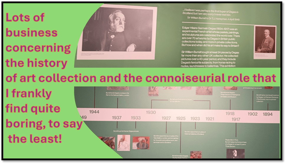 The essays are scholarly versions that address the reception of Degas, and particularly in Britain, where William Burrell (the source of the original Burrell collection) was a major factor in the appreciation, storage and gateway of access to the art. But time moves on in the history artistic reception as well as other aspects of social history. The Burrell collection is no longer only those items from Burrell but a major national collection for Scotland, and currently the UK. All of the catalogue essays are on collection. The entrance to the exhibition emphasises the timeline of Degas’s art but always in relation to its collection, a first and less important, in my unscholarly view, stage before art can be received by an audience before the extremely wealthy Yet the museums oft tie themselves to the memorial honour of founders. It will, for many be a detrimental barrier to accessing the art where the reputation of often ruthless businessmen whose interest in art were only aesthetic at a point over the bounds of being economic assets and signs of social significance and worth which can be accrued.