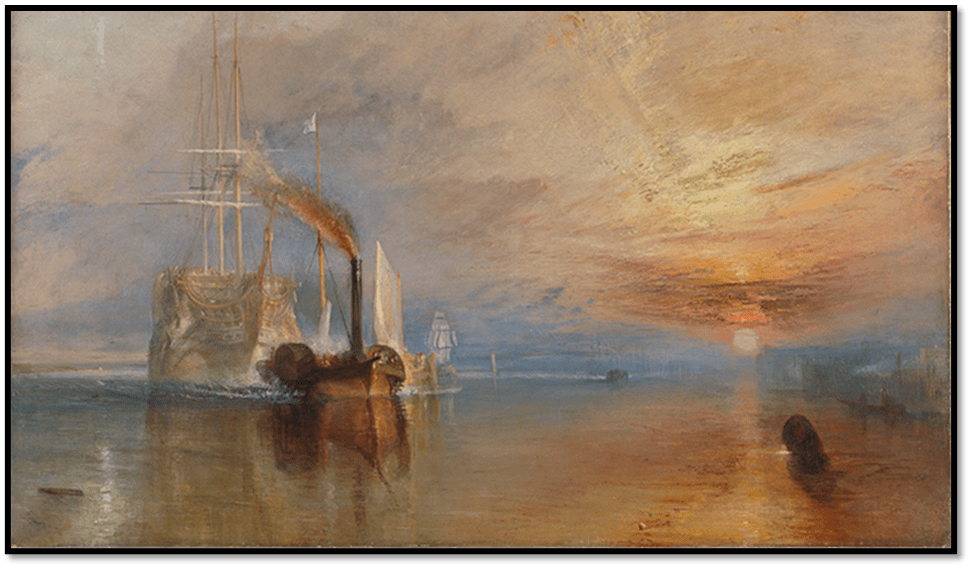 The Fighting Temeraire, regarded as one of the artist’s best-known works, is a tribute to the ship HMS Temeraire. It played a distinguished role in Lord Nelson’s victory at The Battle of Trafalgar in 1805.