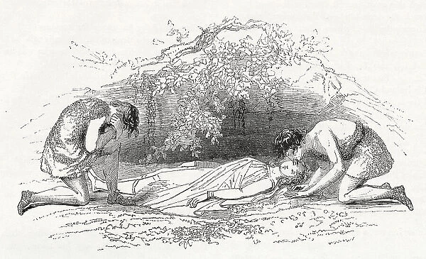 In Act 4 Scene 2 of Cymbeline, a late play of Shakespeare’s, is one of his most famous songs, possibly made so by Virginia Woolf’s obsession with it. It is, though, rarely reprinted as the dramatic lyric or part song, distributed between two roles that it is (Cymbeline, Act , Scene 2, lines 331 – 354). The whole scene is available at this link). In it, two boys mourn the supposed death of another boy they both love and know as Fidele. It is shown in the nineteenth-century Kenny Meadows illustration below: