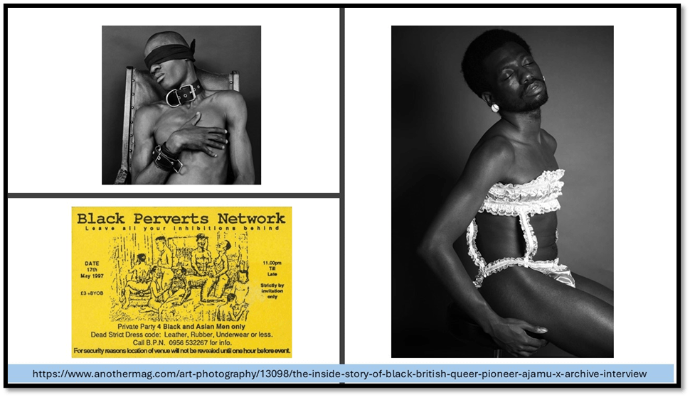 Let us think then now of some of the 6 people honoured and their commonalities and differences, agreements and divisions. Ted Brown, a hero of the early Gay Liberation Front (GLF) sought to secure a ‘more positive representation for LGBT people in the media’, and especially of black gay men.[7] That could, I think he thought be hard to do if he had been in full collaboration with say, Ajamu X, a photographer committed the defence of ‘fetish and fantasy’ in lived queer lives, even in public, and he helped build for these men their ‘own unapologetic spaces’, included the organisation Black Perverse Network, ‘ a safe sex party space bringing together Black and Asian men’.[8]