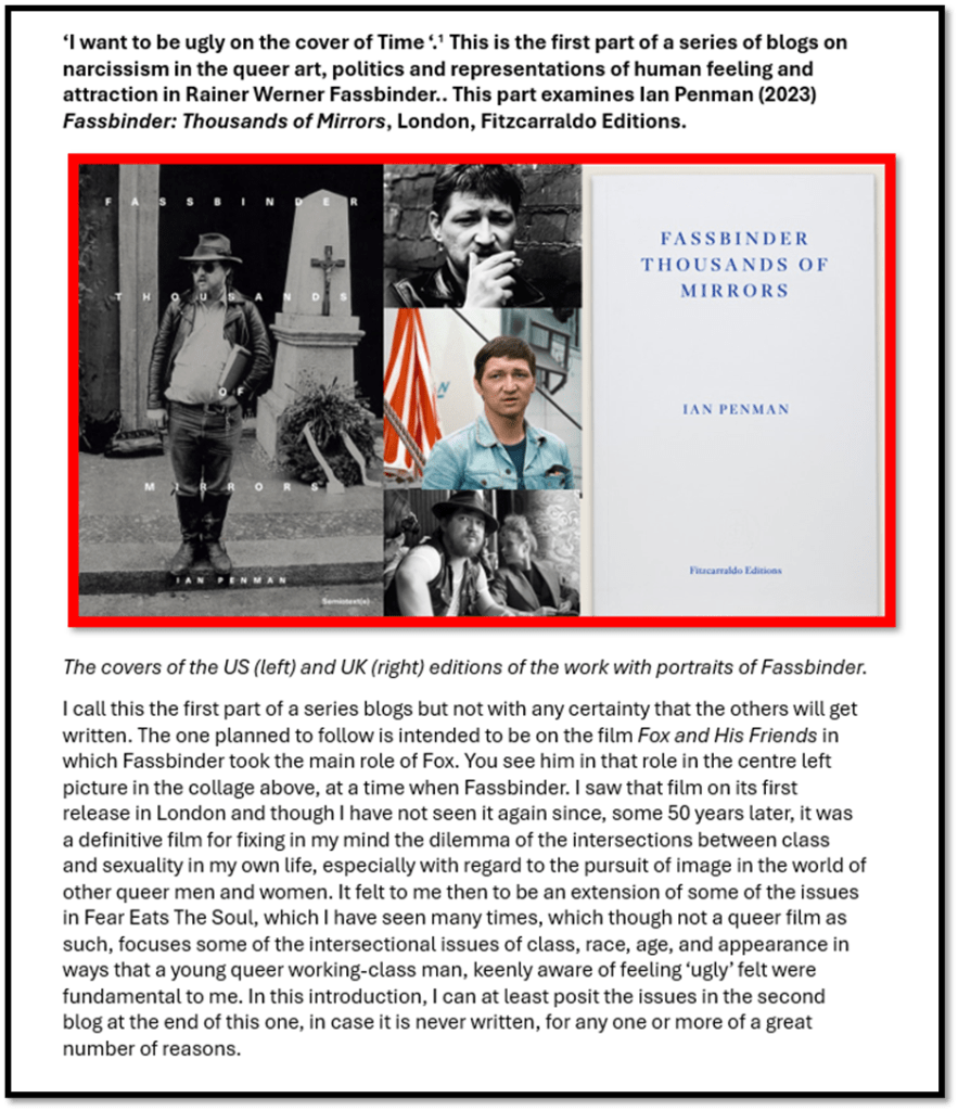 I have started my blog on the Ian Penman book aided by reviews in The Los Angeles Times and, especially, Jacobin, for the latter article, by William Harris, situates it in the history of my conjoint reading and experience – like the impact of Stuart Hall, The Birmingham Centre for Contemporary Politics and the then Marxism Today of Martin Jacques on my politics and life generally. But it is also about growing up queer in a heteronormative and homophobic society we still inhabit but which was much worse then, that developed feelings in many gay young men of being trapped in the necesity of cultivated appearance and the fear of ugliness. I have started my blog, but it needs time and daring. Here is the rough draft of my beginning: