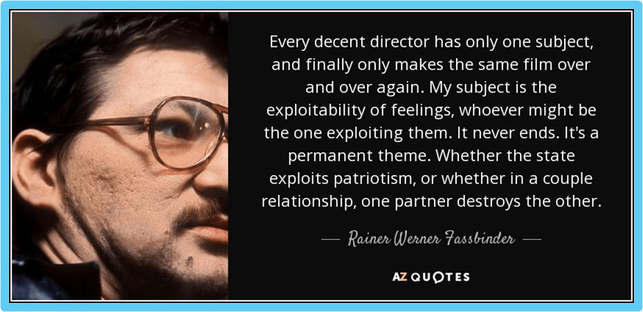 … the no-way-out paradoxes of Fassbinder’s characters as perhaps the projection of a “stunted boy-man, used to fetishizing his own pain, but wholly without empathy for the often far greater pain of others?” Here I disagree—the empathy I find in Fassbinder’s films is greater than that in any others. And if the artist, any true artist, remains a child, it is also to have the “taint of innocence,” as Penman calls it, to see and embody the “hope of love and its distant mirage shape” that manifest in unconditional empathy, the kind we need in our own no-way-out paradox, that of being alive in a world full of hate and pain, that leaves us open to hurt but gives us power nonetheless.[5]
