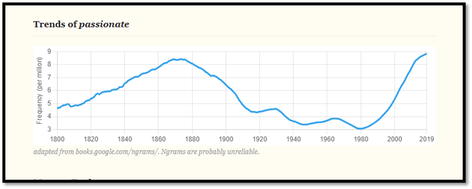 Maybe, as always, we need to consider whether ‘passion’ is not a thing of nature but of human social construction. Though n-grams are considered far from valid as evidence for a number of reasons, they can be used to show, with a pinch of salt necessarily added, that the textual canons used by Google, show historical variation in its frequency of usage. What still needs explanation is the rise in the frequency of use of the word from 1980. Hmm!
