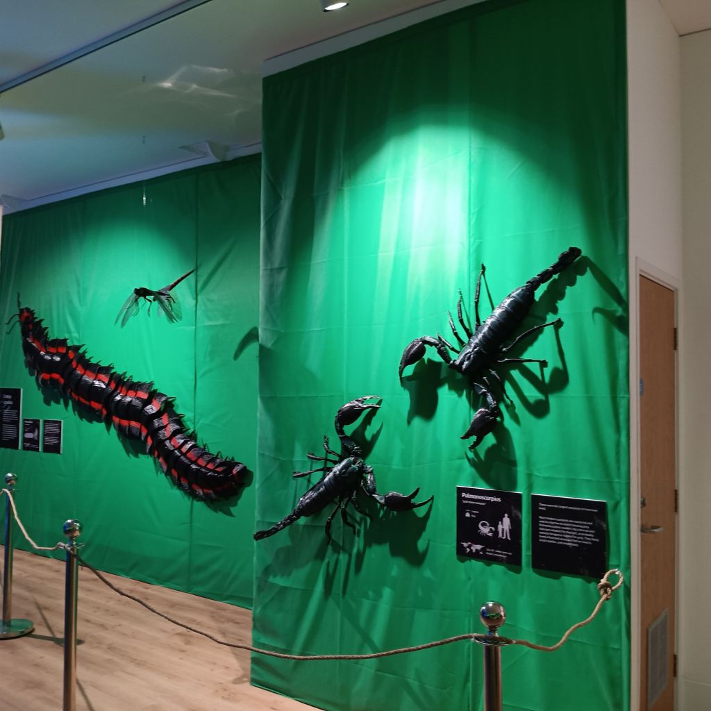This millipede would be, stood on its head, the height of two people, the top standing on the lower one's shoulders, the plaque said. Tom thought of Mum onto Dad's head landing not his shoulders: clumsy thing! But, it's sad this bold red millipede might do headstands Just to measure up to his Mum and Dad. Rather than slither sands and other lands. Nearby that extra-long hardcase insect (he'd learnt that invertebrates had cases Instead of spines),a fear-making aspect, a wall of scorpions, each guarding spaces With the help of a swinging stinging tail, or he imagined the swing; pain follows but in imagination too. 'Better nail that thought now';turning round as he swallows.
