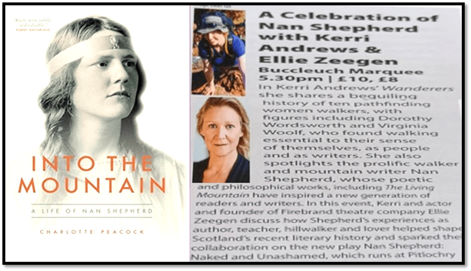 I had a few things lined up, had missed The Walter Scott Prize announcement. My first event I had a few doubts about, for though I love Nan Shepherd’s The Living Mountain and have blogged briefly on the brilliant life by Charlotte Peacock of her but I couldn’t quite get excited about the description of the event, based on Kerri Andrews lovely book Wanderers and a play about Shepherd currently running at Pitlochry. I would love to see that play but could not imagine this event being as it appeared based on talking heads about any number of things; women who walked in nature or cities and wrote about it, and a play I hadn’t seen or read. i was alone in my doubts. so many had booked for the event, it had been transferred to a larger marquee and that was packed to the gills.