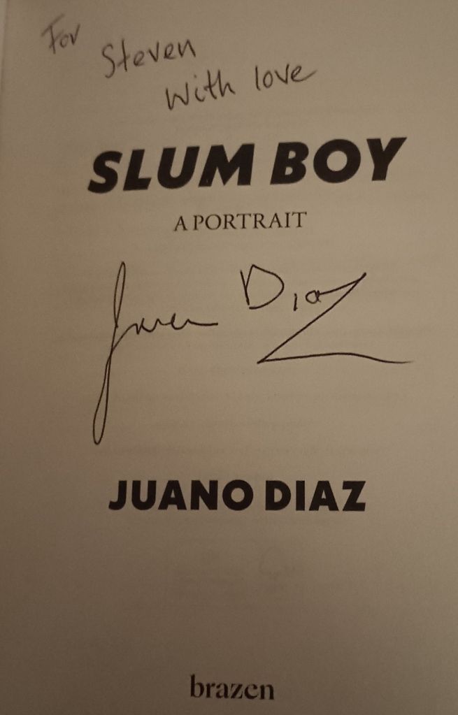 After that event, we had supper at the Orchard food tents, standing with our trays as we waited for the event with Juano Diaz. Juano was a delight and not at all the person I expected; the who might be intuited from my blog on his book Slum Boy. See my earlier blog at this link. The photographs below show a person who responded to his interviewer, a delight himself, bending to hear audience questions and responses too, concerned to answer questions for people as they wanted them answered.