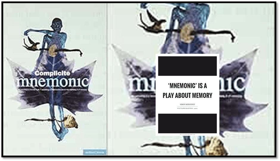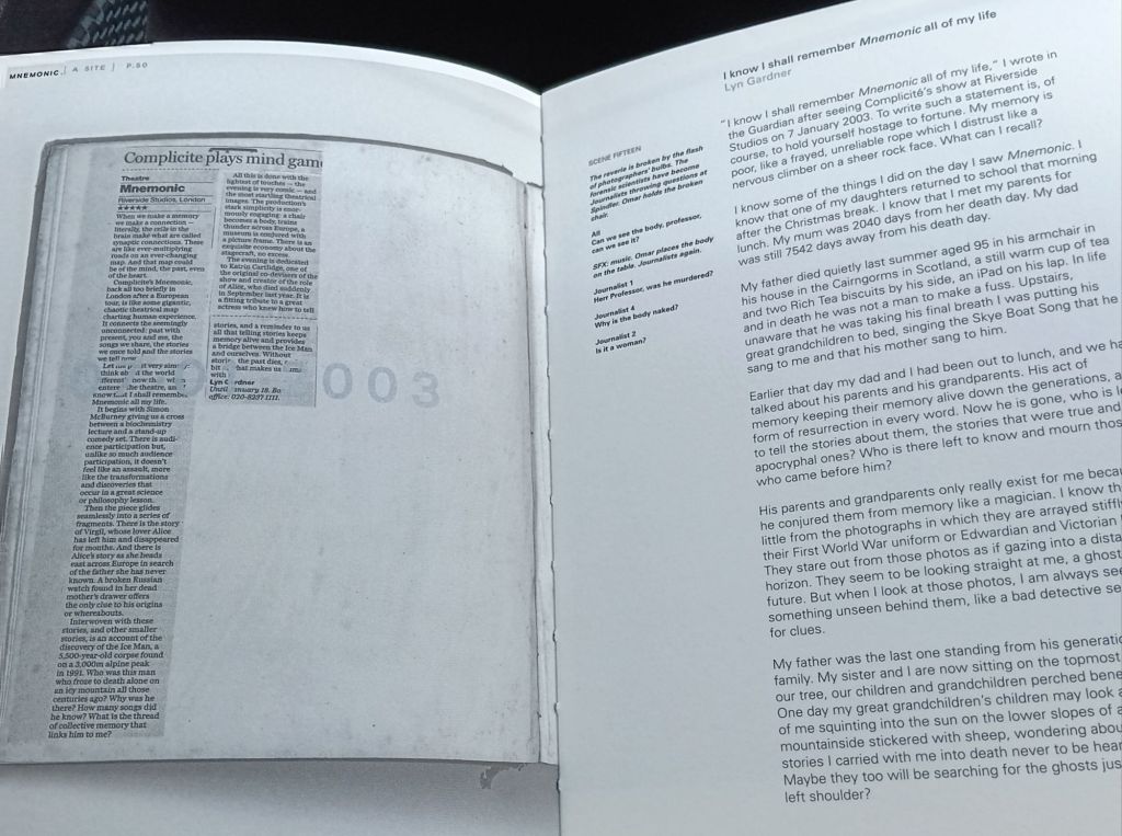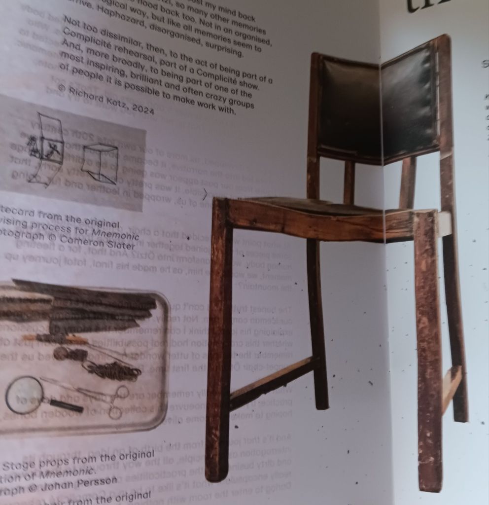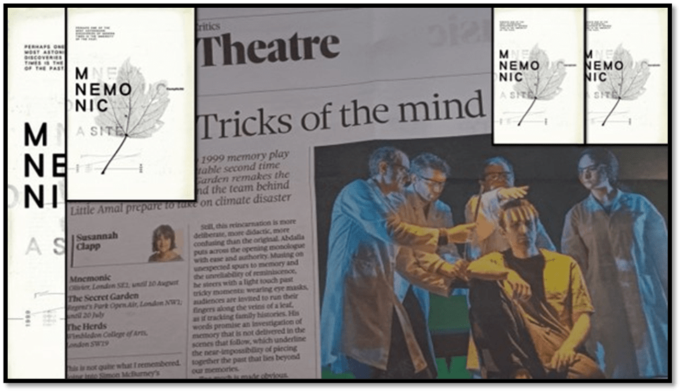 ‘This is not quite what I remembered’, says Susannah Clapp, the theatre critic of The Observer of mnemonic at the National Theatre who had also seen the original production.[1] Clearly she could not have said this had she read with understanding Simon Burney’s fragment discussing the genesis of this ‘revival’ in Complicité: Mnemonic [A Site], a book curated by Tim Bell and Simon McBurney (available at this link) and beautifully designed Russell Warren-Fisher. Neither could she have listened in the theatre for these words are in there too. In the text IThe site of memory is not a place. It is an event. Each time you remember you have to make that memory. … But the memory is different each time’.[2]The site of memory is not a place. It is an event. Each time you remember you have to make that memory. … But the memory is different each time’.[2] This blog is about eventually seeing the play for myself in the Olivier Theatre at 7.30 p.m. 10th July 2024.