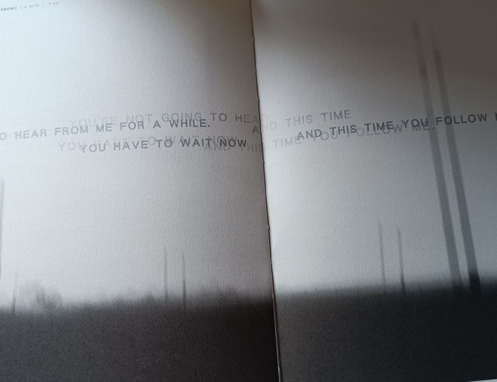 How this production deals with migration and origins that lie behind prohibitive boundaries (even the Irish diaspora) is like the original play nevertheless, if the script is to be believed, and also bears its host like an uneasy ‘double’ of itself. These are effects beautifully captured in [Site]. There are doubles created in that book by simple over-typing, a kind of ghosting of words on each other: