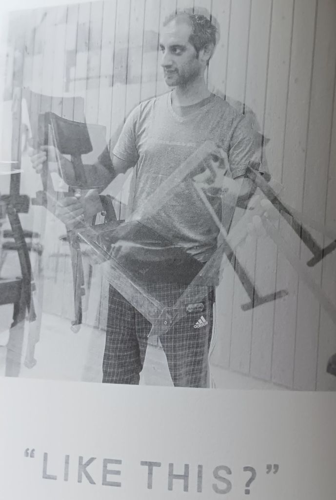 And much in these effects is about how time creates both doubles and the feeling, the classic theme of the doppelgänger, how a thing or person, perhaps even ones#’s self, is identical to its original yet uncannily different, a feeling analysed by Freud in his his essay on The Uncanny. A double-exposure is a trick with time that stamps identity on the non-identical or identical, creating double illusions in each case, as is the palimpsest or over-typing. One of the best examples from [Site] is a series of versions of a picture of Jonathan Katz holding the chair used in all Complicité productions, he tells us, to create an articulated figure that can re-enact Iceman, Ötzi, the name given to the Iceman before, as it were he became Iceman 5, 500 years ago. All this is about doubling, re-multiplied in the mainly exposures of Katz holding the chair in rehearsal. We are told various times that this is the same chair used in the original by Katz.