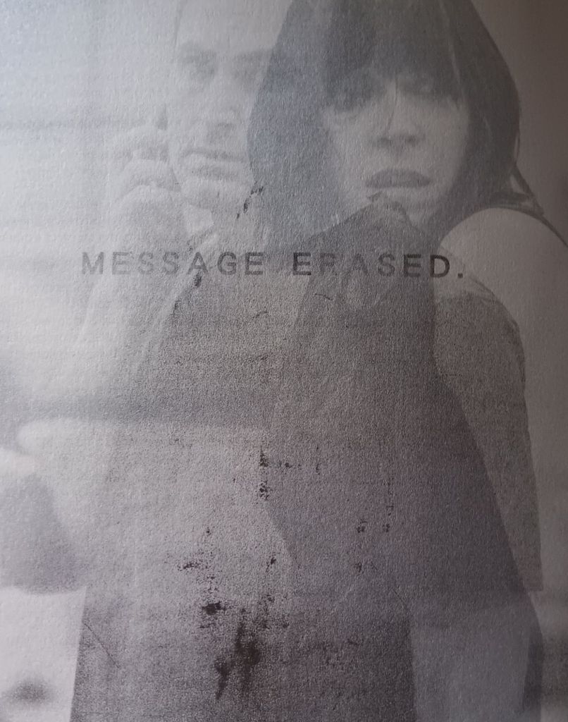 Even text over image is a kind of image, even before the text is doubled on itself. In a captured double exposure of the actors of Omar and Alice, the two persons are exposed each other but the message from the play, also present over, or between in a typeface reading ‘Message Erased’. This is very near the emotional tenor of the play’s meetings that are not meetings and the sens that loss of a person, or their image (or your own self-image) is a kind of semi-erasure.