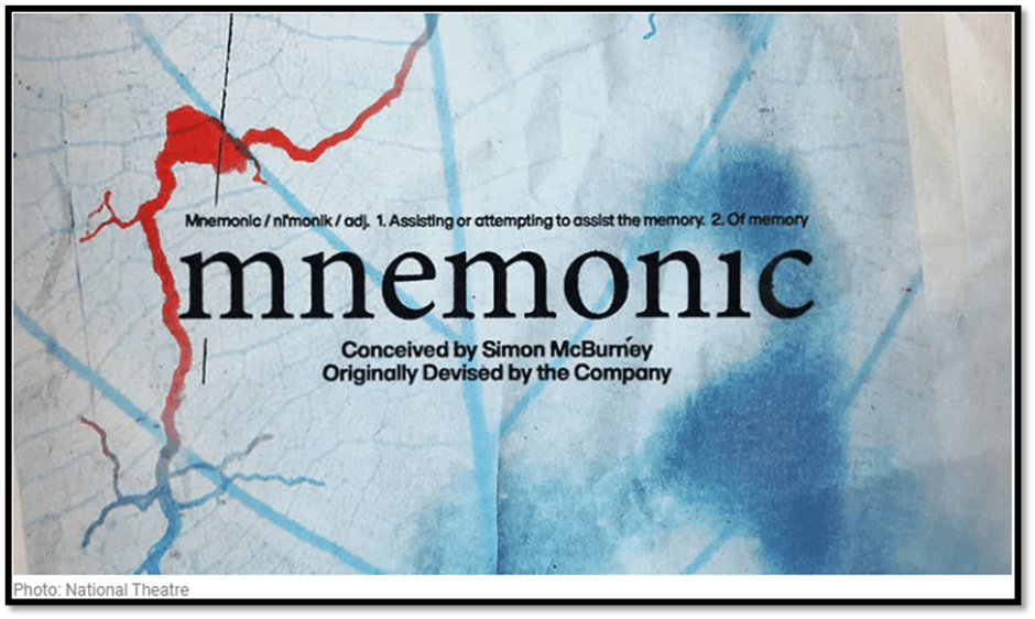 Above is the moment as Geoff, my husband and myself awaited o enter the Stalls entrance to the Olivier Theatre. How unreal feels the transition from outside a known building to the interior in which an i imagined reality will be performed. I think that feeling may be relevant. This blog is a response to preparing for and seeing mnemonic written on and the day after seeing the revival. It follows and refers to an earlier preparatory blog posted on May 7, 2024 (available at this link).