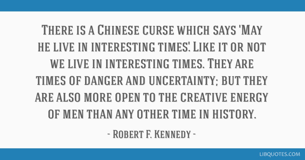 The prompt question today recalls the phrase used in English, ‘May you live in interesting times’? It is known, without much supporting evidence as the “Chinese curse“. In the LibQuote above, it is attributed in longer form to Robert Kennedy, and he elaborates it in seeing turbulence in history as the more interesting option. In the apocryphal Chinese form, the implication is that the danger and negative risk of being in ‘interesting times- of civil, national or international conflict – outweigh the positive risk of creative involvement.