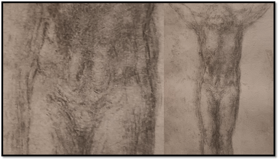 What I see is chalk whether dabbed or rubbed creating flesh that is felt in its ridges of soft flesh and sulci. The focus on Jesus’ groin becomes a series of mysterious marks indicating volume but not shape but lying triumphantly below the central ridge of the torso. The lines indicating the margins of three-dimensions of outer flesh quiver not with the inaccuracies of their making hand in my view but rather of its contemplative desire feeling its way between the spirit and body of the beloved divine made flesh. Even Jesus’ hanging head points us down to that divine torso, offered up and taken, even eaten, in the name of God. The catalogue gives a judgement I find quite beautiful and could be the curators’ riposte to Jonathan Jones, that they know very well and there is no spirit in Michelangelo’s work without showing his ardent desire of the body. It is desire which creates the liminality of the supernatural, whether that be being absorbed in God’s flesh or taken up in spirit – for these late drawings show the cusp between both possibilities, wide in its very trembling intensity. They say: ‘These evocative Christs appear to be the expressions of an effort to represent a body in transition from the temporal to the spiritual world, transcending the physical laws that rule the denser bodies of physical mortals’. [6]