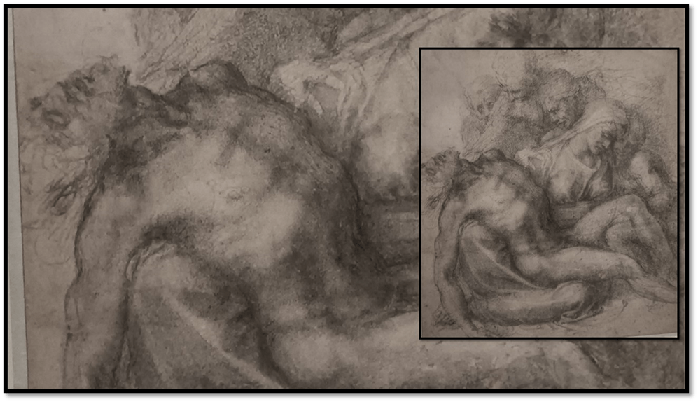 In the private drawings, anatomy and pain in the body, even its involuntary reflexes, matter, as in the beautiful Warwick Pietà. Seeing the original did not change my mind about it from what it was in my preparatory blog, but made me look again at the techniques of drawing that attended to detail, There may be iconographic reasons that the detail of Mary’s nipple is made so prominent but iconography is an insufficient explanation in a drawing meant to be for private reflection. The texts on the wall and the catalogue keep excusing the blurring of Michelangelo’s lines as attributed to failing physical eyesight and surety of hand, but the effects are only different in relation to the icon I collaged earlier with Colonna. Here the multiple lines and hatching make you again feel the flesh as if by touch as you look and to sense the weight of limbs dispersed amongst the limbs of others as opposed to those that touch the ground. The unfinished ankles seem to supply the feet we cannot see and at the same time deny them, so that the figure is ungrounded mainly except or its weight on the resisting flesh of the Mother.