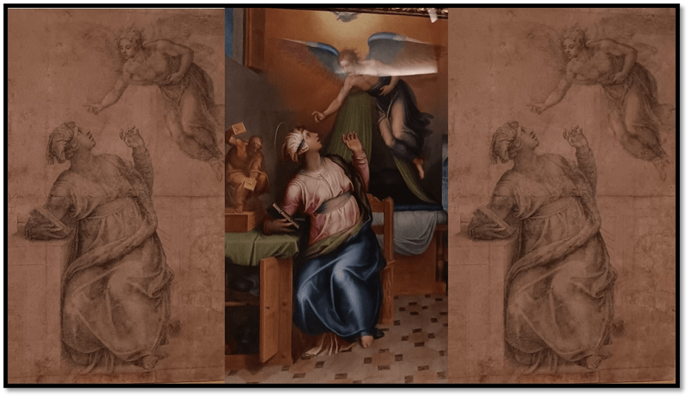 The Crucifixion in the collage above has public and iconic function, perhaps reflected in that conventionalising skull at the base of the cross, and although Michelangelo seems true to the drawing of flesh, the pose and fall of the flesh are not that of deep reflection on the body in pain except in the ideas conveyed through divines like Colonna. I feel much the same about his Annunciation even in drawing, where unusually his designs are clothed, as if anatomy no longer mattered.