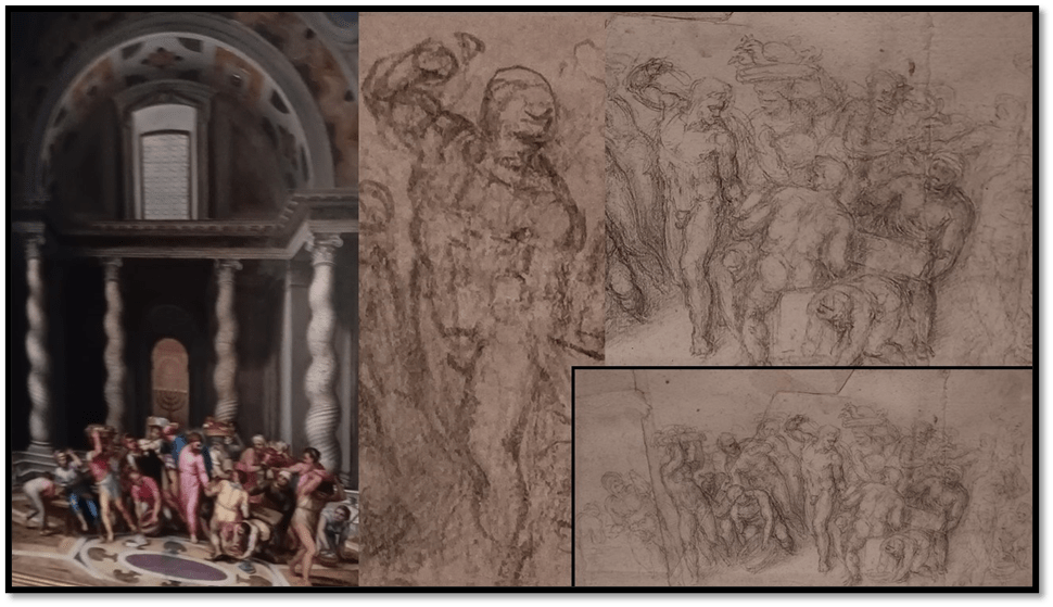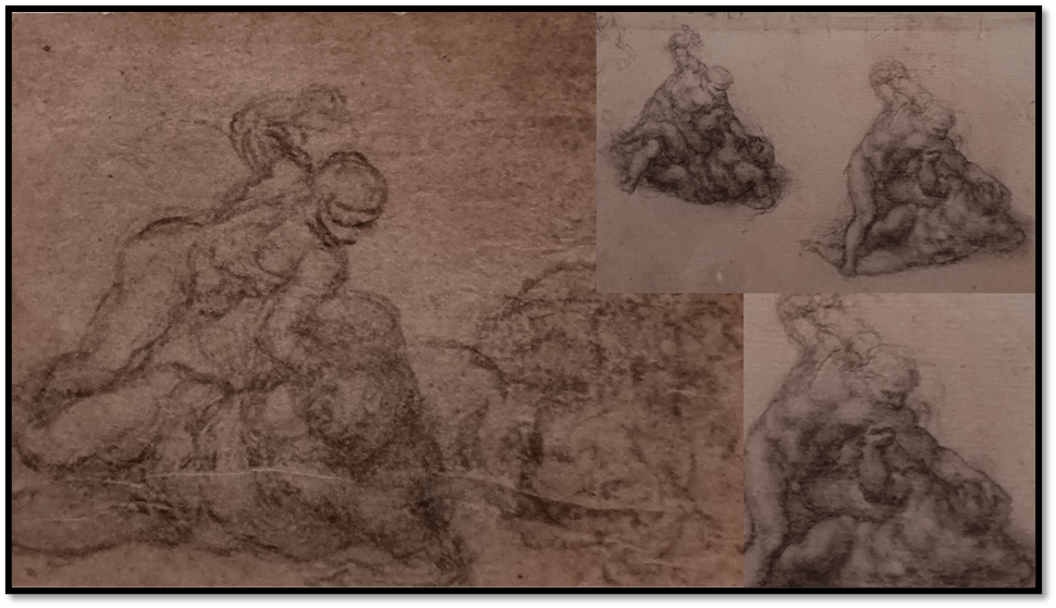 When faces cannot be seen, it is often because Michelangelo is creating drawings that capture the intention and emotion of an interaction as in these preparatory ones of male violence enacted on other men, actually studies of David slaying Goliath).