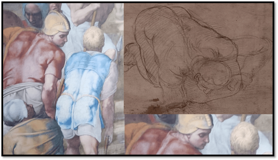 That this expressive capacity can include moments in appreciation of each other’s bodies that tends to the profane is admitted by Michelangelo in a wonderful detail from the painting, shown in facsimile in the exhibition of the Crucifixion (upside down) of St. Peter, where one beautifully muscled and tense back of a worker digging the hole and raising the cross (we see the strain in his torso) turns his attention to the beautiful posterior of a younger male worker alongside him. The gaze of the former draws the viewer’s attention to that moulded posterior> is it appreciative or sexual? Does it matter to determine that truth for soon both must be equally transformed to their task, lowering the weight of Peter on the Cross into the hole dug for it and filling it. As my collage emphasises, it reminds us that for Michelangelo drawing often seems justified by the fact that anyone using his designs must position thee posterior in order to be seen, as in the drawing of the man bending in prostration in the same collage of mine below.