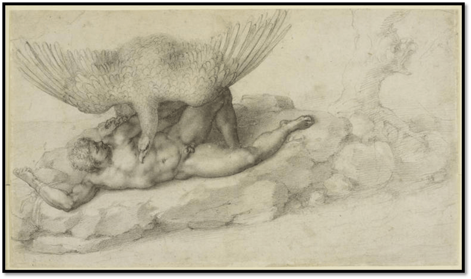Again as Reed says some men notoriously made a virtue of sexual freedom and gained a reputation for a love of ‘boys and beardless youths”, as in the sobriquet-bearing Gianantonio Bazzi (1474 – 1549) (self-promoted as “Il Sodoma” – the Sodomite) and Benevenuto Cellini (1500 – 71).[3] But this potential was already implicit in the idealisation of male beauty – to the point that it was recognised as a matter requiring regulation by church and state – but only under the known temptation to sodomy that was recognised publicly. This is for Reed the case evident in Michelangelo’s exchange of letters with Tomasso when he sent him the letter excerpted on the wall of our exhibition. The pictures including an eagle partaking of the body of a Ganymede (not in the exhibition) as well as the drawing that is. Reed says that codes related to a relationship between an older and younger man in passionate love were apparent but that letters between the pair: