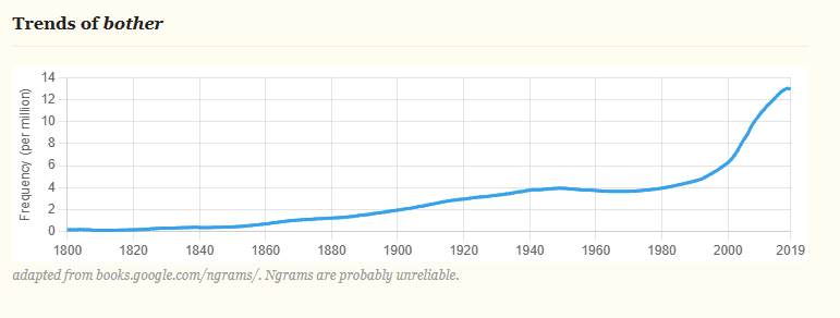 The spectacular rise of frequency in the twenty-first-century may represent the media power of the almost satiric use of the word by Tate’s Lauren Cooper, or the more telling line I remember: ‘Does this face look bovvered’. The cool rejection of the disdain of others is precisely the heroic stance being satirised, often with a sneer at the ‘commonness’ of those who use such phrases, if, in fact, they do. There is something sinister in my view in the trend to make it unfashionable or ‘uncool’ to look or indeed be ‘bothered’ by things.