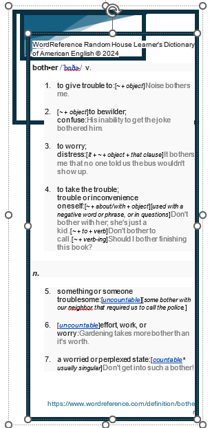 The Random House WordReference site gives the contemporary USA English meanings attributed to the word both as a verb, the form in which we are asked the question in this prompt, and a noun.