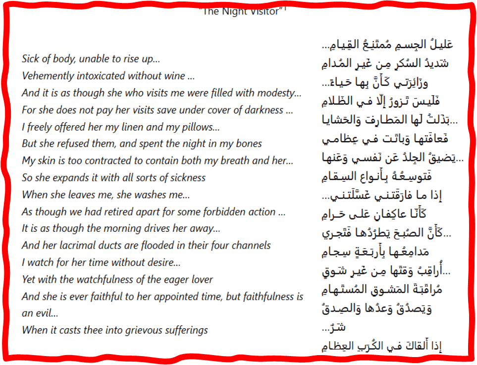 The description in the parent-poem of al-Mutanabbi of the ‘fever’ that medical specialists who read it think may be malarial is feminine. The night-visitor is not only feminised throughout but her femininity is problematic in relation to the poet, almost exclusively in terms of heterosexual desire both expressed and unexpressed, experienced or merely imagined or present only in its absence. She is faithful to time but is filled with shame at the immodesty her visits at night to a man to whom she has no public relationship might suggest if seen. She acts as if they had committed secret sexual congress, whilst clearly not thus engaging. Her contradictions are matched by the poet’s – who is simultaneously demonstrating the ‘watchfulness of the eager lover’ whilst he also watches ‘for her time without desire …’. Of course, she and her actions are but an elaborated metaphor but there is such force that the woman lives inside he poet at night, straining the skin that tries to contain the expansions her interior action causes.