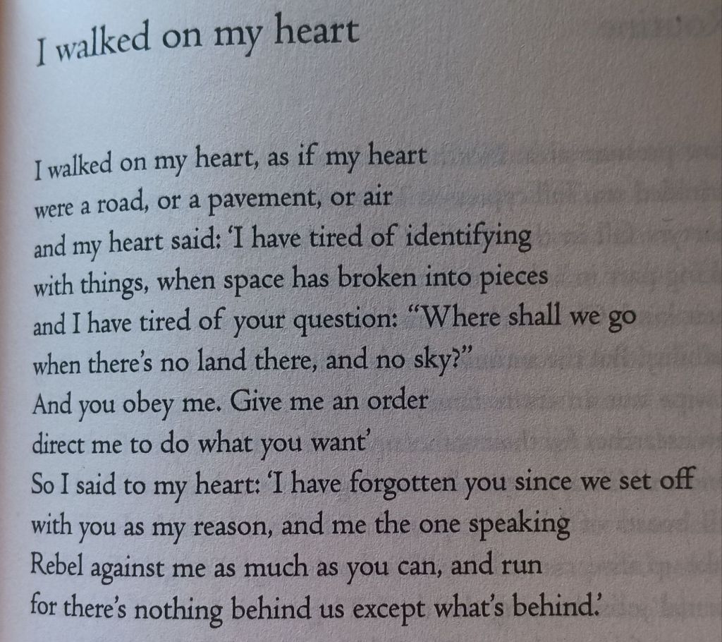 [7] ‘I walked on my heart’ in Mahmoud Darwish [translated from Arabic by Catherine Cobham] (2024: 17) A River Dies of Thirst: Diaries, London, SAQI Books, 17.