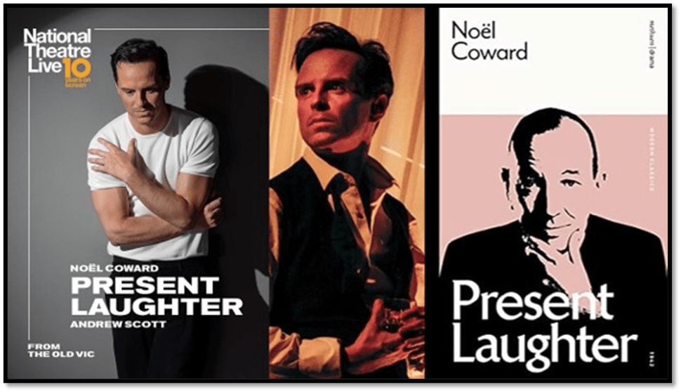 Next Tuesday, I will be going to see the re-streaming of a once live performance of Noël Coward’s Present Laughter with the extremely wonderful Andrew Scott playing the role of Gary Essendine, once played by Coward himself. The play was described by him according to Russel Jackson as ‘not so much a play as a series of autobiographical pyrotechnics’.[1] The point is all, it seems, in the acting as Garry says himself to Daphne Stillington. Daphne is a young woman who falls in love with him (as so many do in the play) as she sees him on the stage, and returns to his flat, to be put into the unheated and ice-cold guest room. That happens before the play opens but must be at some point that may or may not imply the occurrence of any sexual interaction beforehand.