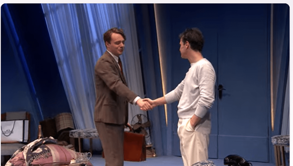 In the trailer I saw for the production I will see in full soon, Roland Maule’s is paying his first visit to Garry to get his verdict on his ‘play of ideas’ (Coward is satirising the writers who were introducing critical perspectives into a theatre dominated by bourgeois-appealing jingoistic, upper-middle class social comedy drama, farce, and musicals). As he leaves, Maule holds stickily onto Garry’s hand, not wanting to be ejected.