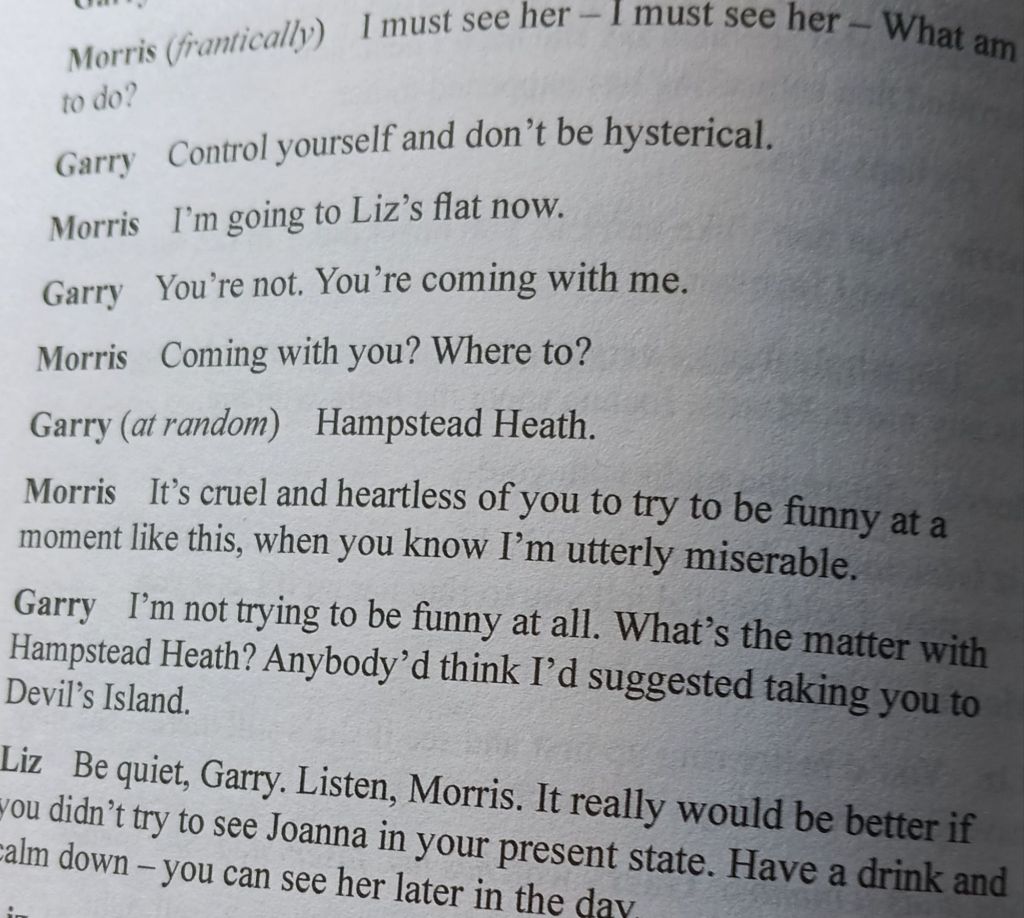 There is a particular subterranean reference to this in Act Two, Scene 2, when there is an exchange between Garry and Morris, the convenient mask sexual ‘affair’ for Joanna Lyppiat (Morris being a friend of her husband, Henry Lyppiat, for her attempt to snare Garry into a real sexual affair. Morris does think he is  Joanna’s sexual choice, too, but that is how such complexities of queer choice are coded.