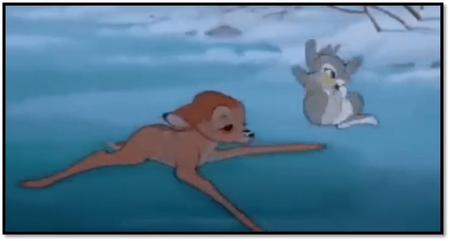 Bambi fitted in other ways. Bambi can’t skate and Thumper, the boy-man rabbit, ridicules him by banging his foot on the ice. other boys took to ice slides as if there bodies had been balanced by design. I fell, legs spanned like Bambi’s, if not so numerous.